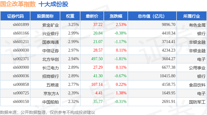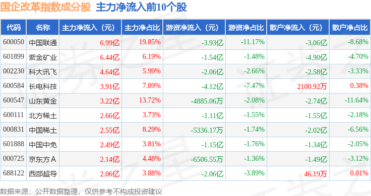 资金流向方面,国企改革(399974)指数成份股当日主力资金净流出合计10.81亿元,游资资金净流出合计8811.4万元,散户资金净流入合计11.69亿元。成份股资金流向详情见下表: