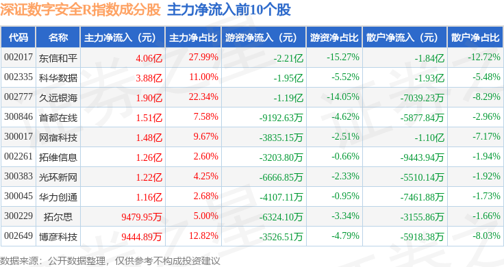 资金流向方面,深证数字安全R(470052)指数成份股当日主力资金净流入合计3.55亿元,游资资金净流出合计12.45亿元,散户资金净流入合计8.89亿元。成份股资金流向详情见下表: