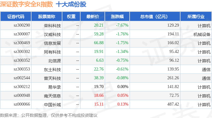 证券之星消息,1月9日,深证数字安全R(470052)指数报收于3886.59点,涨3.07%,成交613.42亿元,换手率6.92%。当日该指数成份股中,上涨的有42家,奥飞数据以10.33%的涨幅领涨,下跌的有7家,荣科科技以7.67%的跌幅领跌。