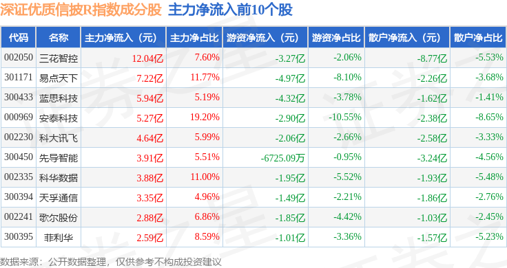 资金流向方面,深证优质信披R(470065)指数成份股当日主力资金净流出合计60.51亿元,游资资金净流出合计4.17亿元,散户资金净流入合计64.67亿元。成份股资金流向详情见下表: