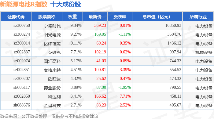 证券之星消息,1月9日,新能源电池R(480027)指数报收于3775.45点,涨1.03%,成交645.64亿元,换手率2.93%。当日该指数成份股中,上涨的有37家,科华数据以8.13%的涨幅领涨,下跌的有11家,阿特斯以3.0%的跌幅领跌。