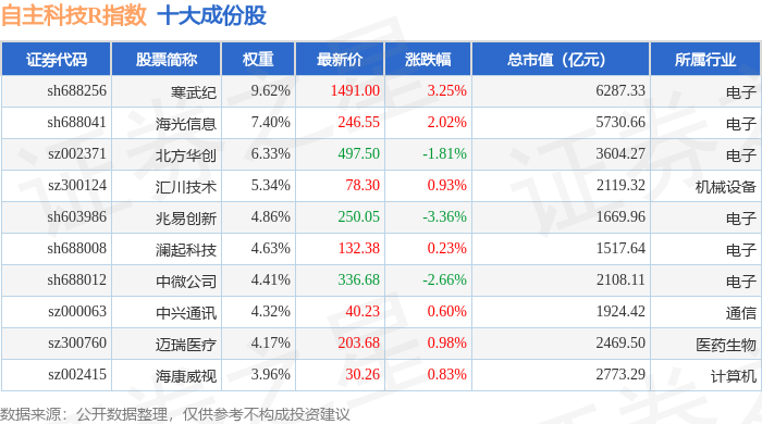 证券之星消息,1月9日,自主科技R(480033)指数报收于10911.73点,涨1.16%,成交1422.33亿元,换手率3.33%。当日该指数成份股中,上涨的有41家,上海瀚讯以15.23%的涨幅领涨,下跌的有8家,兆易创新以3.36%的跌幅领跌。