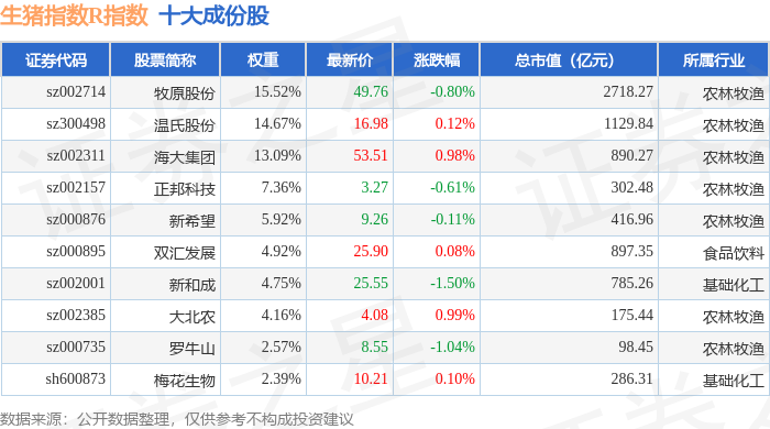 证券之星消息,1月9日,生猪指数R(480073)指数报收于3562.18点,涨0.18%,成交103.93亿元,换手率1.48%。当日该指数成份股中,上涨的有29家,蔚蓝生物以4.79%的涨幅领涨,下跌的有8家,新和成以1.5%的跌幅领跌。