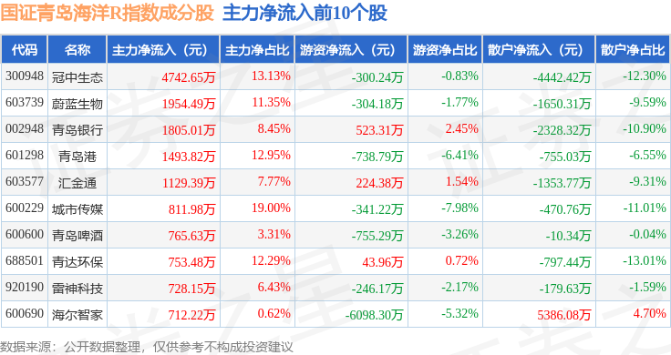 资金流向方面,国证青岛海洋R(480532)指数成份股当日主力资金净流入合计2636.6万元,游资资金净流出合计4563.98万元,散户资金净流入合计1402.65万元。成份股资金流向详情见下表: