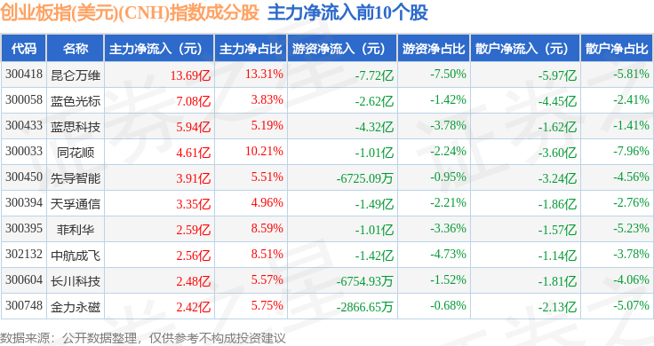 资金流向方面,创业板指(美元)(CNH)(970007)指数成份股当日主力资金净流出合计43.04亿元,游资资金净流入合计18.57亿元,散户资金净流入合计24.47亿元。成份股资金流向详情见下表: