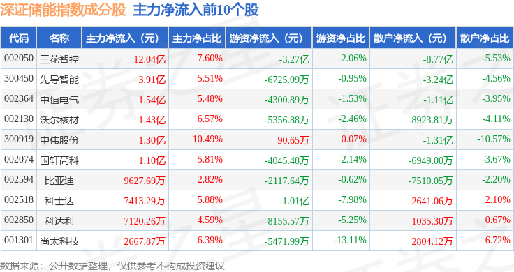 资金流向方面,深证储能(970036)指数成份股当日主力资金净流出合计6.44亿元,游资资金净流出合计7.26亿元,散户资金净流入合计13.7亿元。成份股资金流向详情见下表: