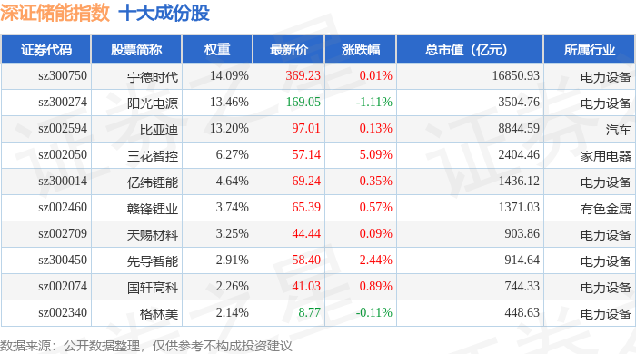 深证储能(970036)指数十大成份股详情如下: