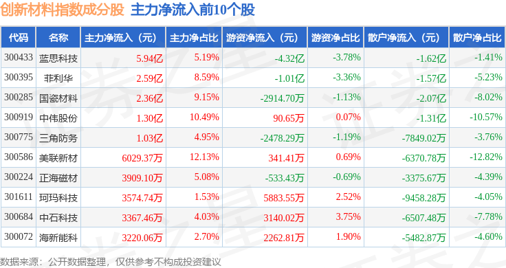 资金流向方面,创新材料(970039)指数成份股当日主力资金净流出合计4.41亿元,游资资金净流出合计5.01亿元,散户资金净流入合计9.42亿元。成份股资金流向详情见下表: