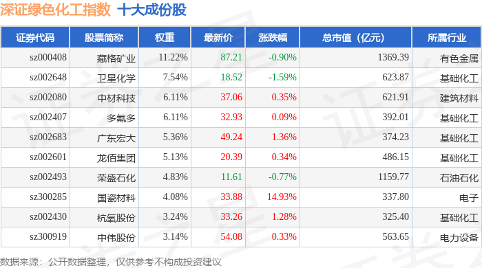 证券之星消息,1月9日,深证绿色化工(970076)指数报收于1861.12点,涨0.89%,成交498.25亿元,换手率2.36%。当日该指数成份股中,上涨的有38家,国瓷材料以14.93%的涨幅领涨,下跌的有12家,东岳硅材以2.61%的跌幅领跌。