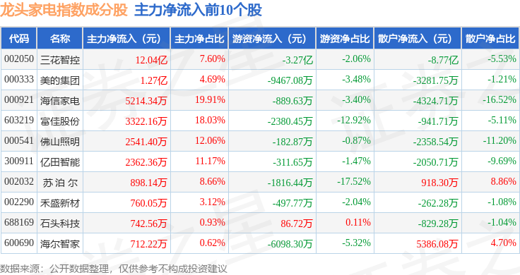 资金流向方面,龙头家电(980028)指数成份股当日主力资金净流入合计12.74亿元,游资资金净流出合计5.22亿元,散户资金净流出合计7.52亿元。成份股资金流向详情见下表: