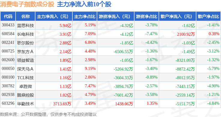资金流向方面,消费电子(980030)指数成份股当日主力资金净流出合计29.81亿元,游资资金净流入合计2.7亿元,散户资金净流入合计27.11亿元。成份股资金流向详情见下表:
