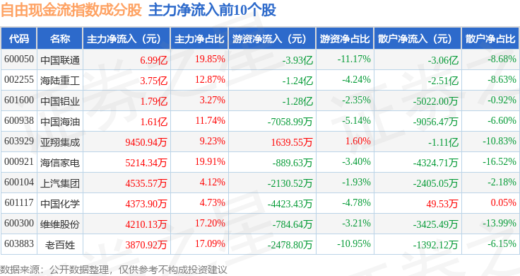资金流向方面,自由现金流(980092)指数成份股当日主力资金净流入合计5.0亿元,游资资金净流出合计8.81亿元,散户资金净流入合计3.82亿元。成份股资金流向详情见下表: