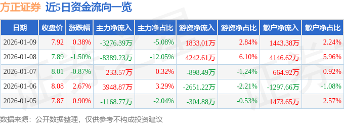 证券之星消息,截至2026年1月9日收盘,方正证券(601901)报收于7.92元,上涨0.38%,换手率0.99%,成交量81.6万手,成交额6.45亿元。