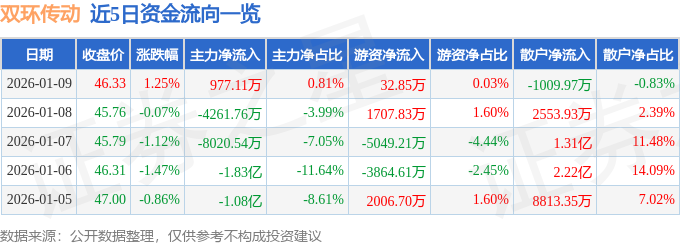 证券之星消息,截至2026年1月9日收盘,双环传动(002472)报收于46.33元,上涨1.25%,换手率3.46%,成交量26.14万手,成交额12.13亿元。