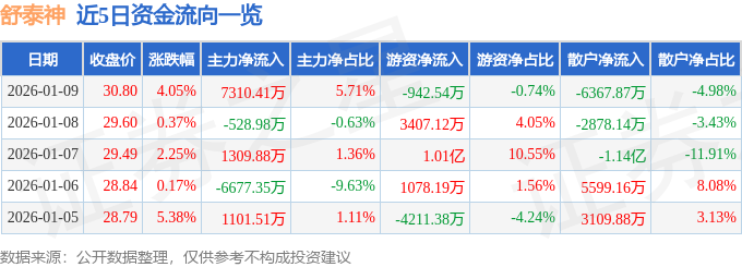 1月9日的资金流向数据方面,主力资金净流入7310.41万元,占总成交额5.71%,游资资金净流出942.54万元,占总成交额0.74%,散户资金净流出6367.87万元,占总成交额4.98%。