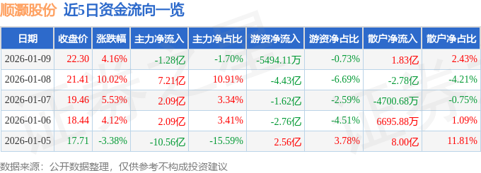 证券之星消息,截至2026年1月9日收盘,顺灏股份(002565)报收于22.3元,上涨4.16%,换手率32.91%,成交量348.84万手,成交额75.17亿元。