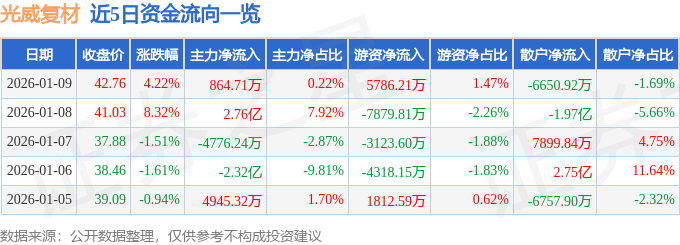 证券之星消息,截至2026年1月9日收盘,光威复材(300699)报收于42.76元,上涨4.22%,换手率11.36%,成交量93.28万手,成交额39.41亿元。