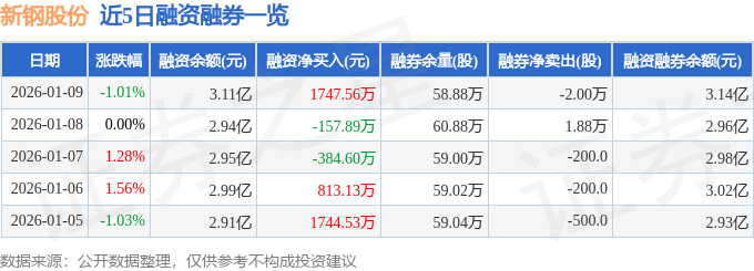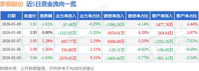 证券之星消息,截至2026年1月9日收盘,新钢股份(600782)报收于3.91元,下跌1.01%,换手率2.7%,成交量84.93万手,成交额3.33亿元。