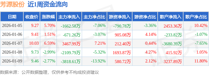 资金流向数据方面,本周芳源股份主力资金合计净流出4794.25万元,游资资金合计净流入2601.29万元,散户资金合计净流入2192.96万元。本周资金流向一览见下表: