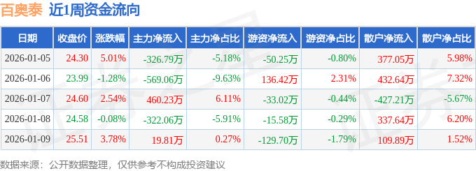 资金流向数据方面,本周百奥泰主力资金合计净流出737.87万元,游资资金合计净流出92.14万元,散户资金合计净流入830.01万元。本周资金流向一览见下表: