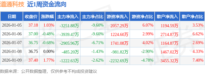 资金流向数据方面,本周道通科技主力资金合计净流出1.18亿元,游资资金合计净流入1808.46万元,散户资金合计净流入9996.67万元。本周资金流向一览见下表: