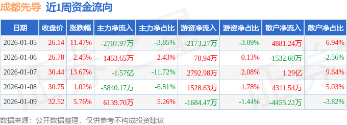 资金流向数据方面,本周成都先导主力资金合计净流出1.67亿元,游资资金合计净流入542.81万元,散户资金合计净流入1.61亿元。本周资金流向一览见下表: