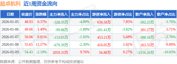 资金流向数据方面,本周超卓航科主力资金合计净流入798.68万元,游资资金合计净流入1355.31万元,散户资金合计净流出2153.99万元。本周资金流向一览见下表: