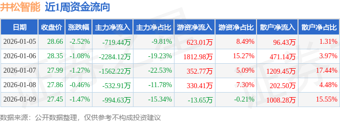 资金流向数据方面,本周井松智能主力资金合计净流出6093.33万元,游资资金合计净流入3105.51万元,散户资金合计净流入2987.81万元。本周资金流向一览见下表:
