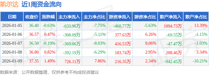 资金流向数据方面,本周凯尔达主力资金合计净流出977.19万元,游资资金合计净流入733.47万元,散户资金合计净流入243.72万元。本周资金流向一览见下表:
