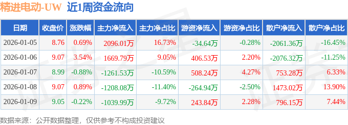 资金流向数据方面,本周精进电动主力资金合计净流入256.19万元,游资资金合计净流入859.03万元,散户资金合计净流出1115.23万元。本周资金流向一览见下表: