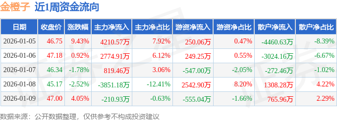 资金流向数据方面,本周金橙子主力资金合计净流入3742.84万元,游资资金合计净流入1940.18万元,散户资金合计净流出5683.01万元。本周资金流向一览见下表: