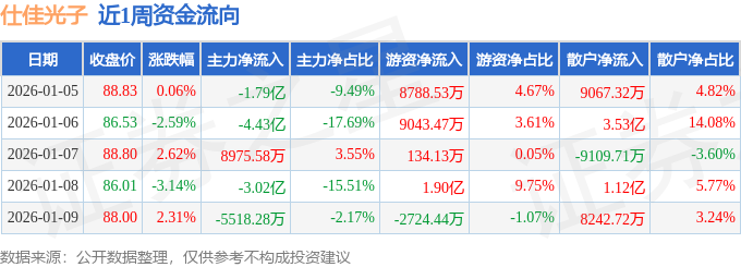 资金流向数据方面,本周仕佳光子主力资金合计净流出8.89亿元,游资资金合计净流入3.42亿元,散户资金合计净流入5.47亿元。本周资金流向一览见下表: