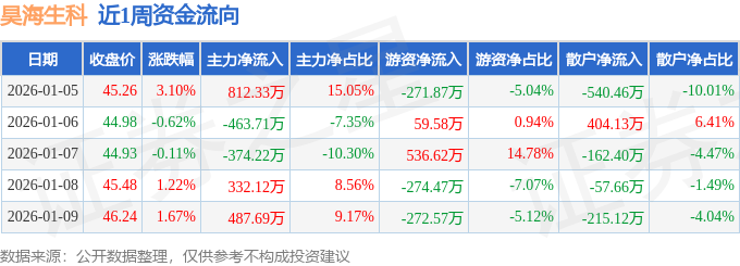 资金流向数据方面,本周昊海生科主力资金合计净流入794.21万元,游资资金合计净流出222.7万元,散户资金合计净流出571.51万元。本周资金流向一览见下表: