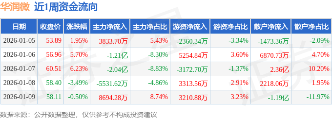 沪深股通持股方面,截止2026年1月9日收盘,华润微沪股通持股数为1356.52万股,占流通股比为102.0%。