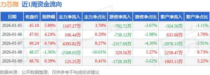 资金流向数据方面,本周力芯微主力资金合计净流入3146.76万元,游资资金合计净流出5237.37万元,散户资金合计净流入2090.61万元。本周资金流向一览见下表:
