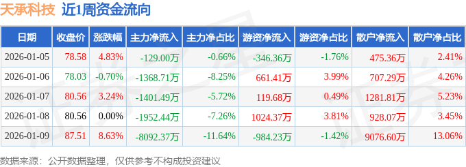 资金流向数据方面,本周天承科技主力资金合计净流出1.29亿元,游资资金合计净流入474.87万元,散户资金合计净流入1.25亿元。本周资金流向一览见下表: