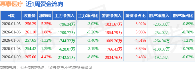 沪深股通持股方面,截止2026年1月9日收盘,惠泰医疗沪股通持股数为425.73万股,占流通股比为437.0%。