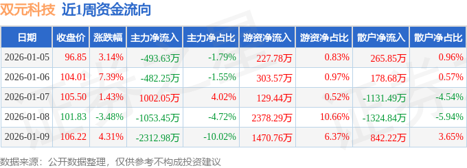 资金流向数据方面,本周双元科技主力资金合计净流出3340.26万元,游资资金合计净流入4509.84万元,散户资金合计净流出1169.58万元。本周资金流向一览见下表:
