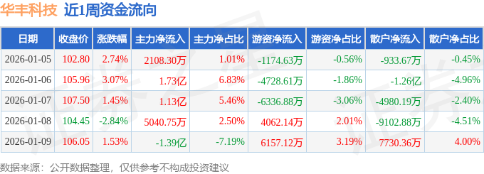资金流向数据方面,本周华丰科技主力资金合计净流入2.19亿元,游资资金合计净流出2020.86万元,散户资金合计净流出1.99亿元。本周资金流向一览见下表: