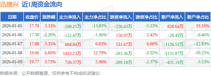 资金流向数据方面,本周迅捷兴主力资金合计净流入2017.76万元,游资资金合计净流出118.34万元,散户资金合计净流出1899.42万元。本周资金流向一览见下表: