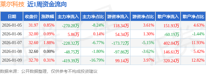资金流向数据方面,本周莱尔科技主力资金合计净流出960.87万元,游资资金合计净流入0.25万元,散户资金合计净流入960.62万元。本周资金流向一览见下表: