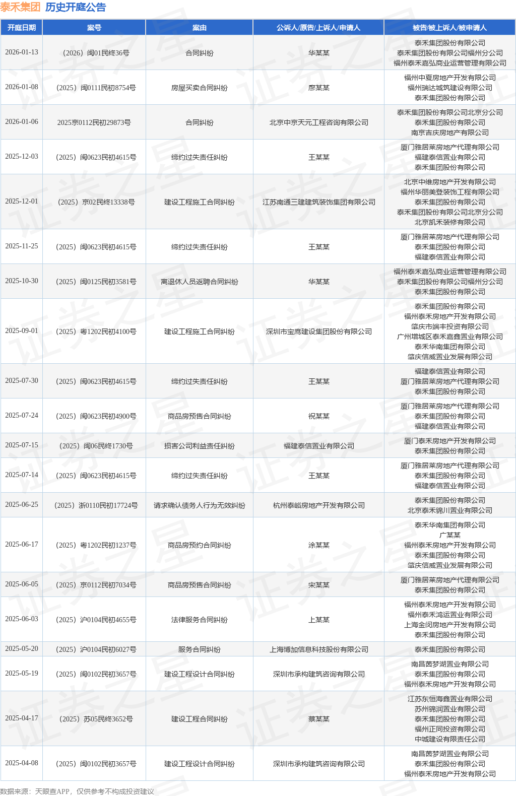 案号:(2026)闽01民终36号根据统计,近一年内以泰禾集团股份有限公司为当事人的历史开庭公告有31则,其中案由为“合同纠纷”的公告以4则居首,其次为“缔约过失责任纠纷”有4则,“建设工程设计合同纠纷”有2则。历史开庭公告(前20条)如下: