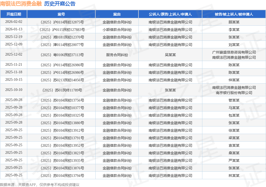 案号:(2025)沪0115民初127883号根据统计,近一年内以南银法巴消费金融有限公司为当事人的历史开庭公告有2965则,其中案由为“金融借款合同纠纷”的公告以2952则居首,其次为“借款合同纠纷”有6则,“不当得利纠纷”有2则。历史开庭公告(前20条)如下: