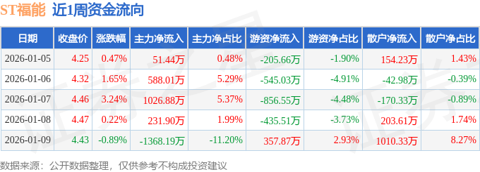 资金流向数据方面,本周ST福能主力资金合计净流入530.03万元,游资资金合计净流出1684.88万元,散户资金合计净流入1154.86万元。本周资金流向一览见下表: