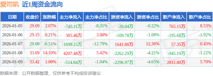 资金流向数据方面,本周爱司凯主力资金合计净流入1553.84万元,游资资金合计净流出4047.28万元,散户资金合计净流入2493.44万元。本周资金流向一览见下表: