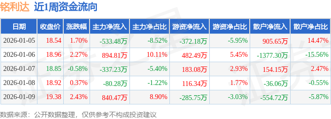 资金流向数据方面,本周铭利达主力资金合计净流入784.3万元,游资资金合计净流入123.98万元,散户资金合计净流出908.28万元。本周资金流向一览见下表: