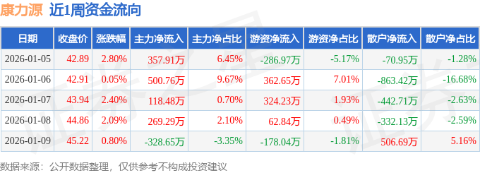 资金流向数据方面,本周康力源主力资金合计净流入917.79万元,游资资金合计净流入284.72万元,散户资金合计净流出1202.5万元。本周资金流向一览见下表:
