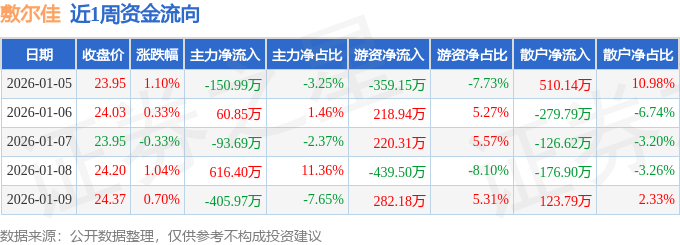 资金流向数据方面,本周敷尔佳主力资金合计净流入26.6万元,游资资金合计净流出77.22万元,散户资金合计净流入50.62万元。本周资金流向一览见下表: