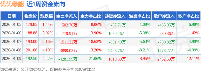 资金流向数据方面,本周优优绿能主力资金合计净流入2410.94万元,游资资金合计净流出2535.74万元,散户资金合计净流入124.8万元。本周资金流向一览见下表:
