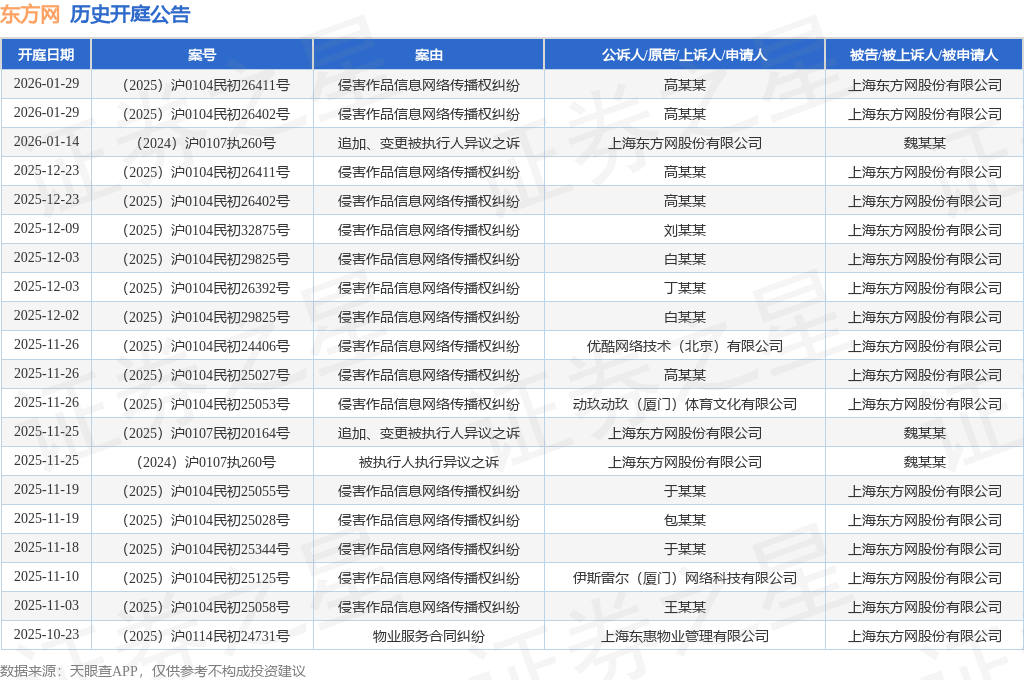 案号:(2024)沪0107执260号根据统计,近一年内以上海东方网股份有限公司为当事人的历史开庭公告有39则,其中案由为“侵害作品信息网络传播权纠纷”的公告以29则居首,其次为“著作权权属、侵权纠纷”有5则,“物业服务合同纠纷”有2则。历史开庭公告(前20条)如下: